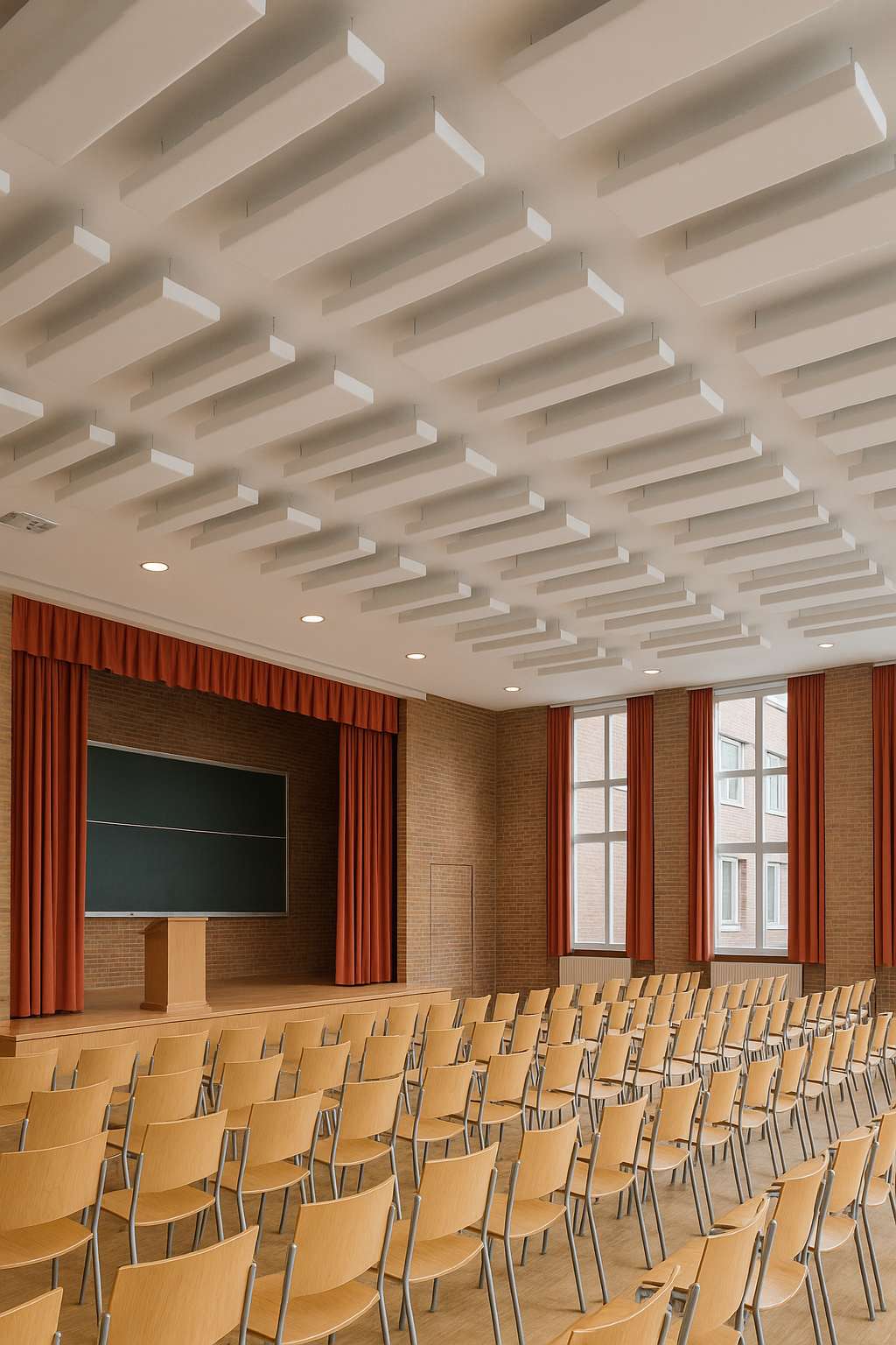 High-volume spaces such as sports halls and assembly rooms need overhead absorption. Ceiling baffles and acoustic rafts provide maximum surface area and performance.